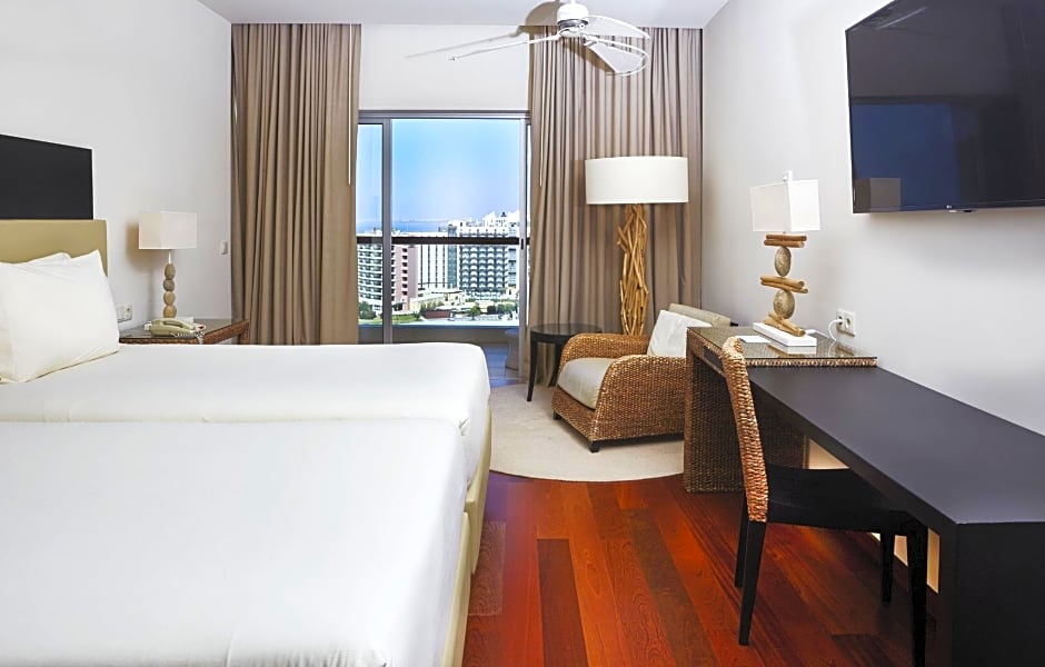 FRONTAL SEA VIEW HIGH FLOOR is 474 square feet and includes either 2 single beds 80-130 width or a king-size bed 150-183 width plus living room.